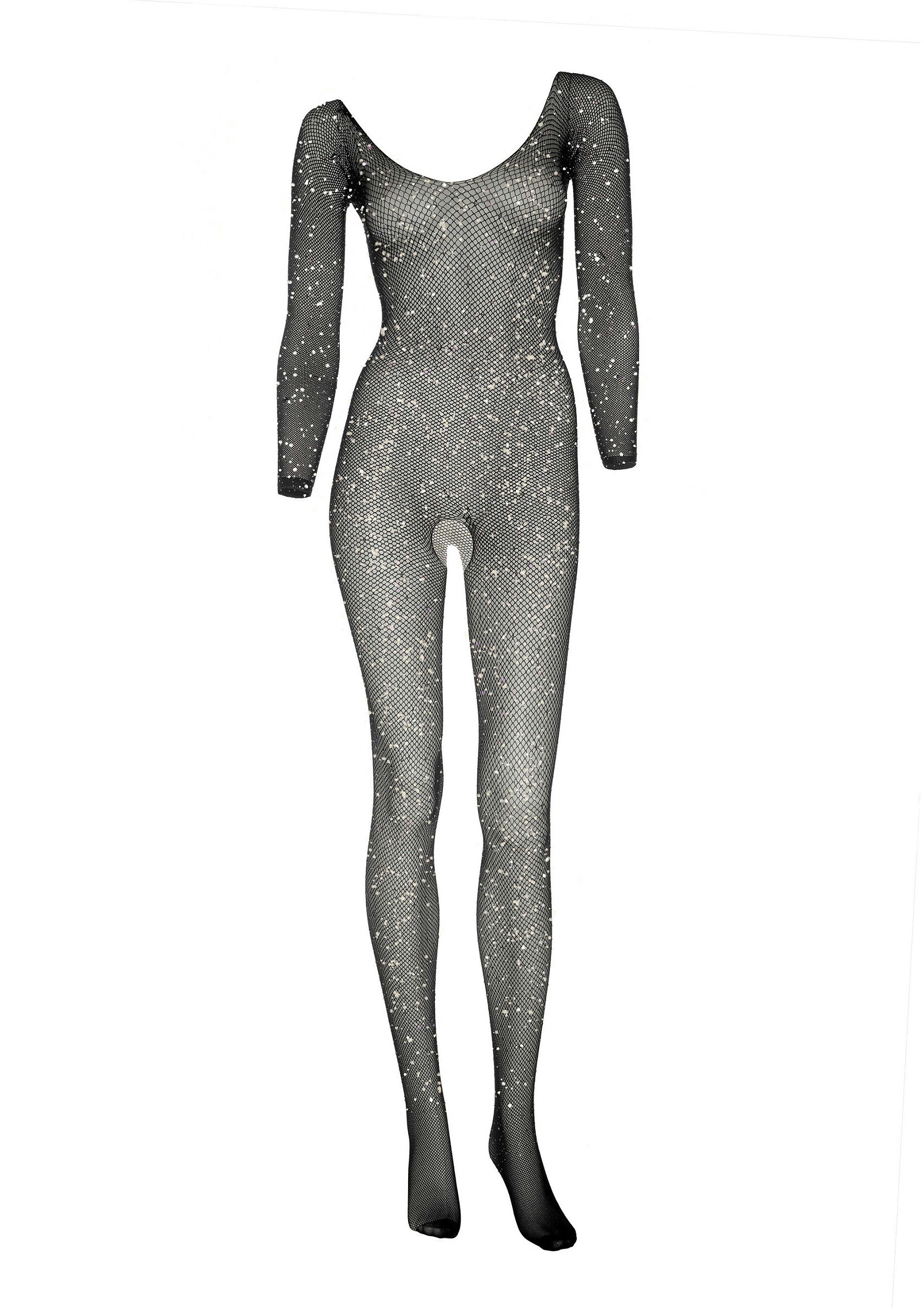Kristal naadloze fishnet bodystock met lange mouwen en open kruis.